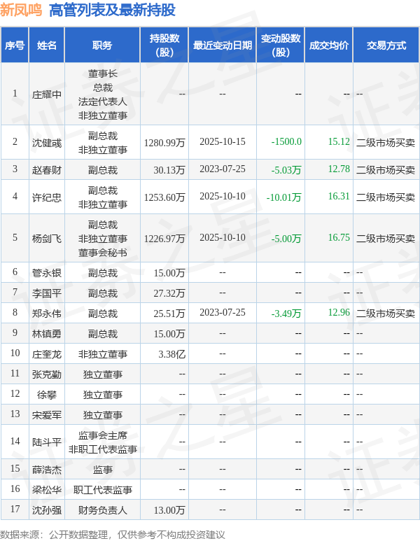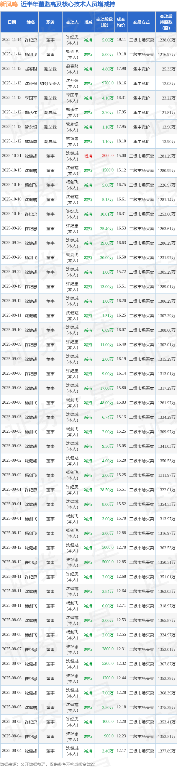 新凤鸣近半年内的董监高及核心技术人员增减持详情如下: